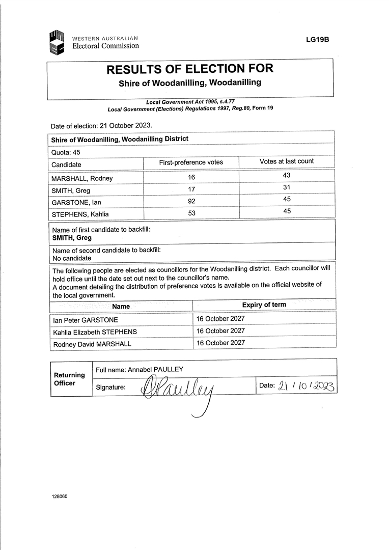 Shire of Woodanilling, Councillor Candidate - GARSTONE, Ian